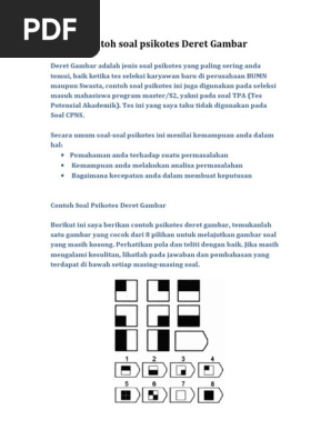 untuk "Soal Psikotes Deret Gambar Pdf : Pdf Contoh Soal Psikotes Bosche Nero Academia Edu : Dalam soal psikotes tersebut, terdapat 20 soal psikotes deret angka dimana kamu langsung bisa melihat hasil dari jawaban kamu."