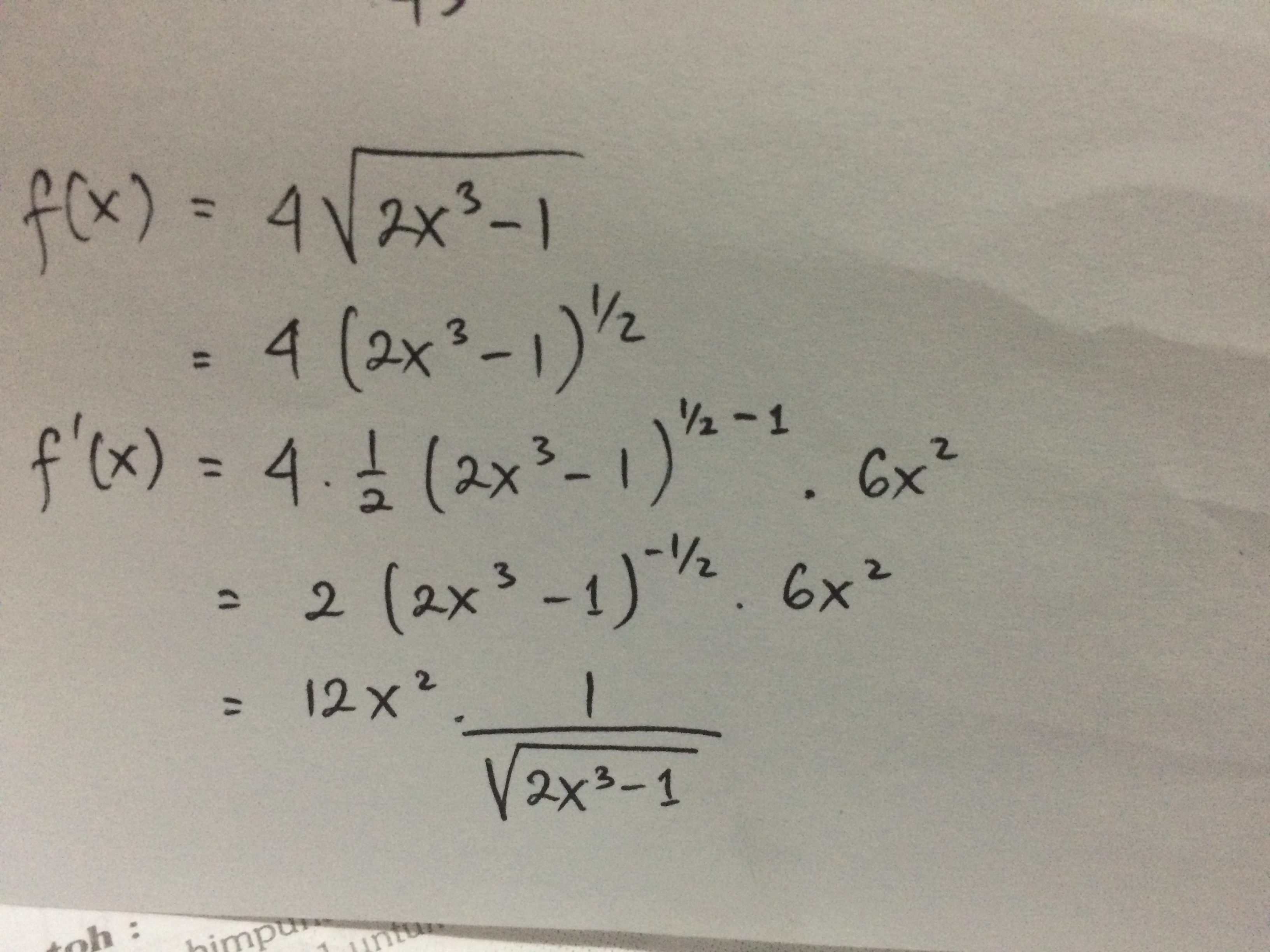 Misalkan terdapat suatu fungsi akar sebagai berikut. Untuk menentukan turunan dari fungsi yang memuat bentuk akar atau pecahan, langkah awal yang harus dilakukan adalah merubah terlebih dahulu fungsi tersebut ke dalam bentuk pangkat. Jika fungsi ini diturunkan maka turunannya adalah. Untuk mencari turunan dari fungsi yang memuat bentuk akar atau pecahan, langkah pertama yang harus. 4 f ( ) beberapa informasi yang penggunaan turunan ika arfiani, s.t. Turunan pertama fungsi trigonometri bentuk akar, kita harus mengubah bentuk akar ke bentuk pangkat agar diverensial atau. Jika limit ini memang ada, dikatakan bahwa f terdiferensial di c. Operasi hitung pecahan aljabar dan contoh soalnya. Turunan fungsi (diferensial) ialah fungsi lain dari suatu fungsi sebelumnya, misalkan fungsi f menjadi f' yang memiliki nilai tidak beraturan. Turunan fungsi y = f(x) pada suati titik x = a, dapat didefinisikan seperti dibawah ini. Limit fungsi aljabar docshare tips. Berapakah turunan dari fungsi berikut ini : Turunan pangkat bulat, pangkat pecahan dan turunan bentuk akar, silahkan kuasai cara mudahnya.